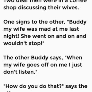 Two deaf men were in a coffee shop discussing their wives. One signs to the other, “Buddy my wife was mad at me last night! She went…